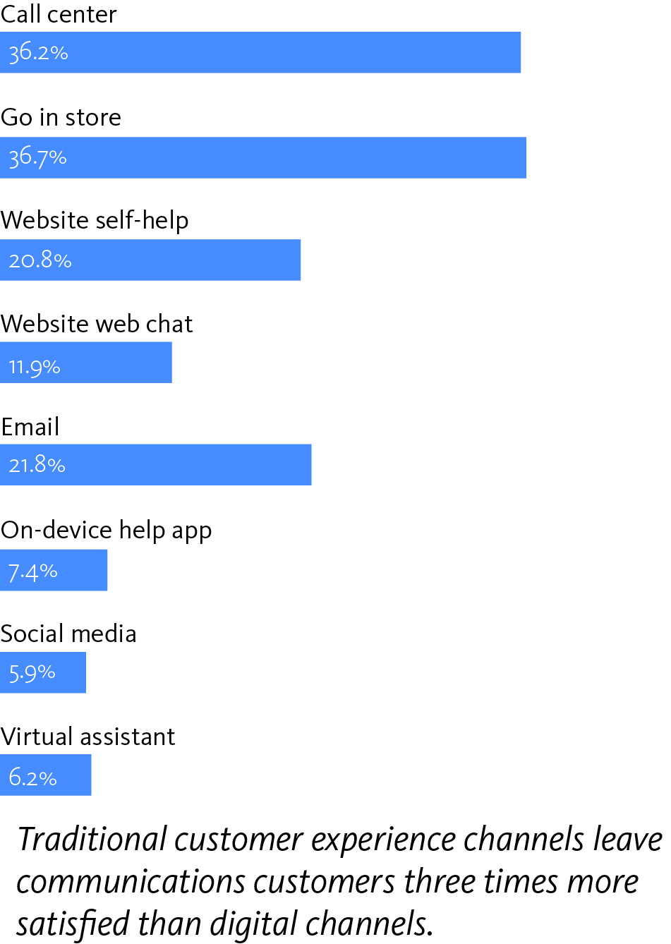 Communications consumers prefer traditional (58 percent) to digital channels (42 percent) for contacting a brand; however, overall digital channel usage has increased 50 percent since 2015, driven by social media and on-device help apps. The survey also found communications brands have 10 minutes or less across the majority of channels to resolve a customer’s question if they want to make a significant impact on satisfaction levels.